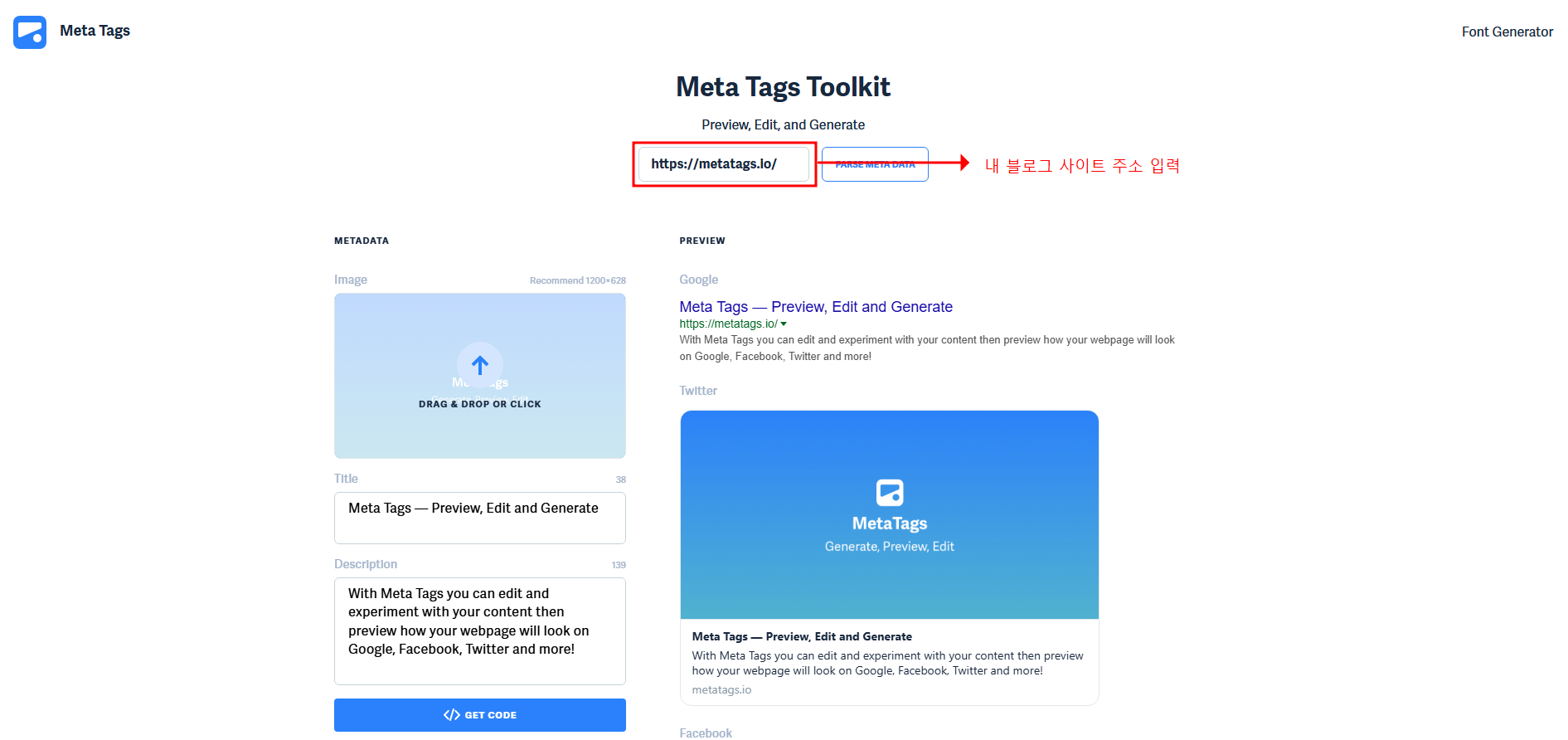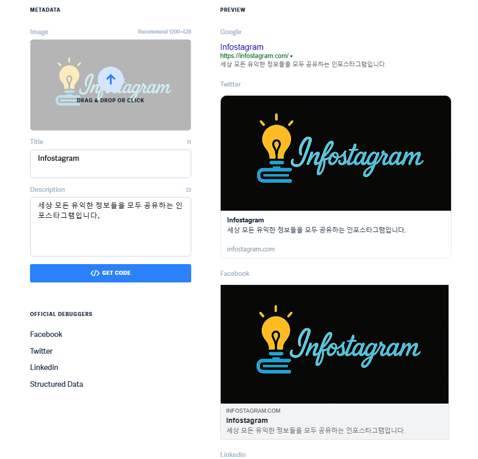 https://metatags.io 이 사이트에 들어가면, 입력한 메타 태그가 검색 결과, 페이스북, 트위터 등에서 어떻게 보일지 바로 미리보기로 보여줘요. 사용 방법은 정말 간단해요: