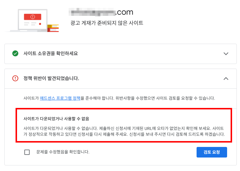 가장 기본적이면서도 빈번하게 발생하는 원인은 사이트 자체의 접속 불가입니다. 신청 당시에는 사이트가 열리더라도, 심사 시점에 서버가 일시적으로 다운되거나, 웹 호스팅의 문제로 인해 페이지가 열리지 않으면 애드센스 심사 봇이 사이트를 불러올 수 없게 됩니다.